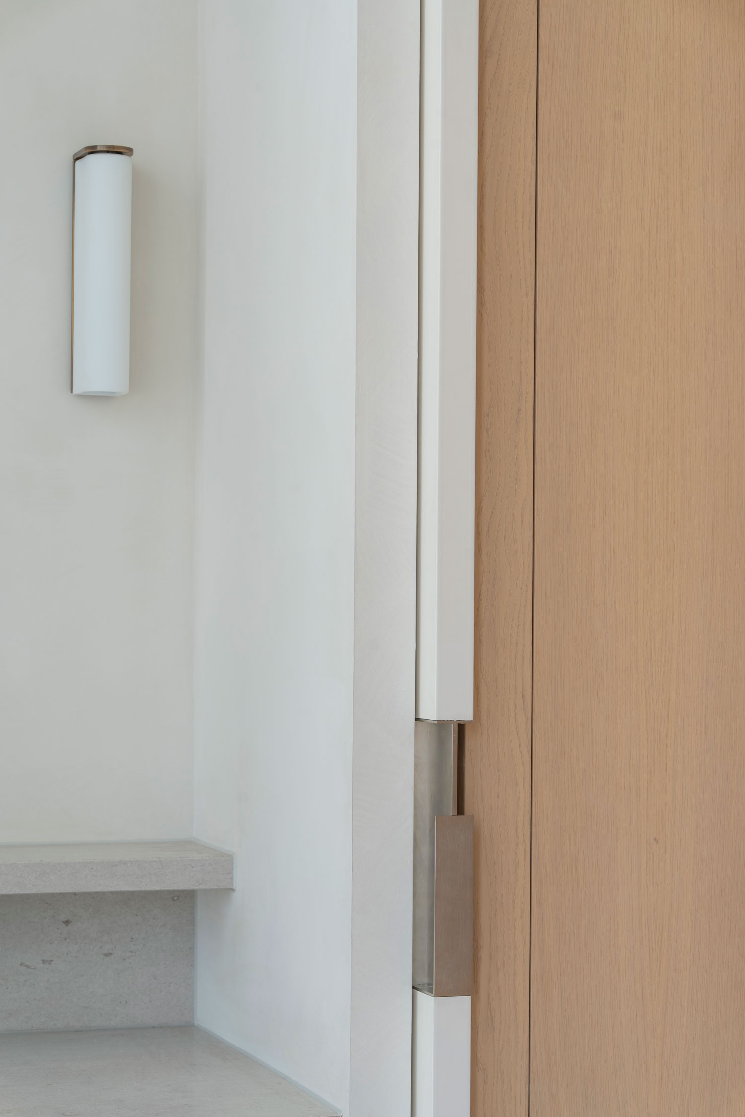 The custom brass-clad pivot door became a defining feature, adding both weight and elegance to the entry.